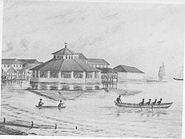 Known as the first market in Singapore4, it was originally located on the south bank of the Singapore River. It was then moved to Teluk Ayer Bay when the government acquired the land for commercial use. As can be seen from the picture, the market was just a simple wooden structure with an attap roof, and it stood till 1836.5